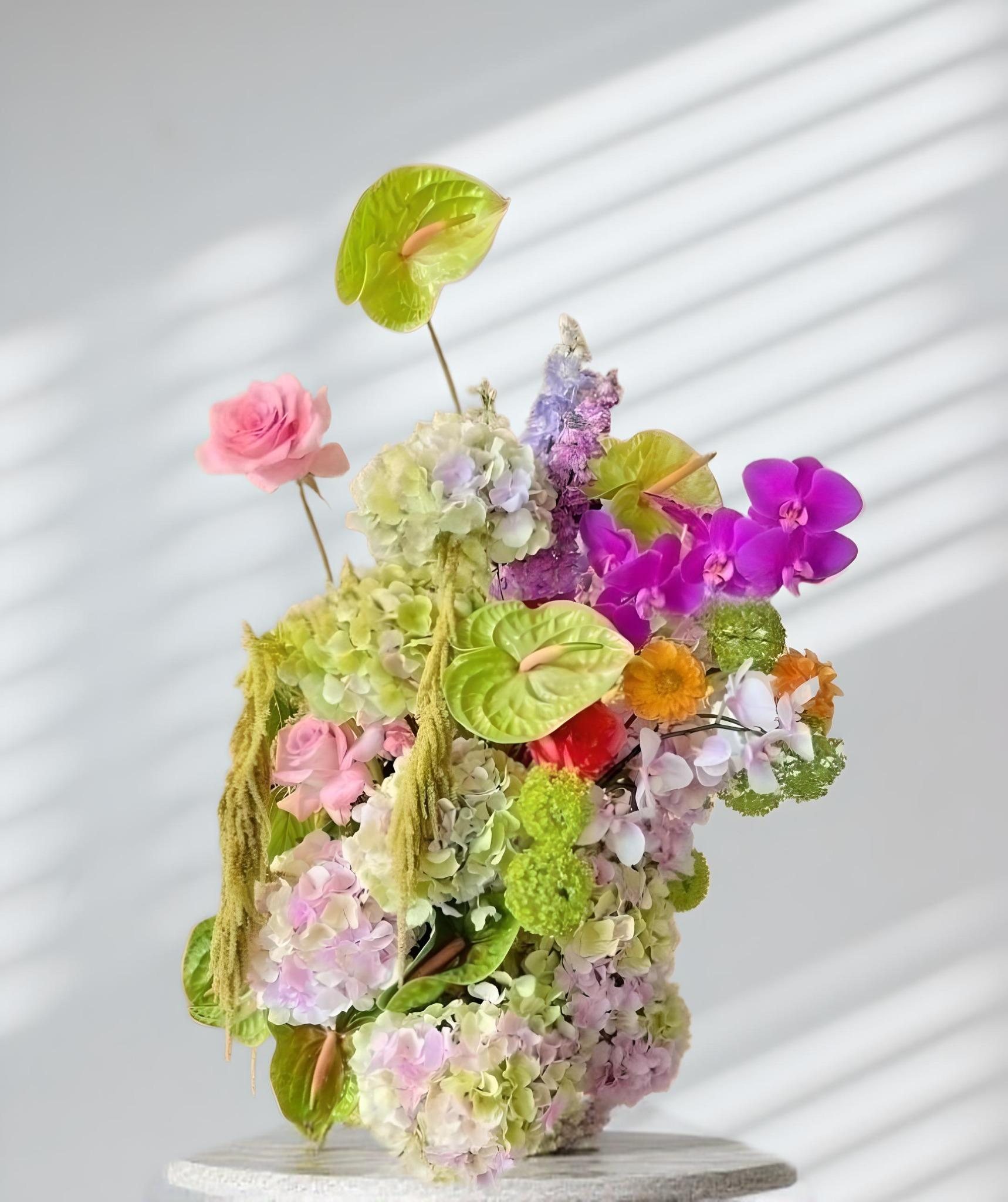 Enjoy an explosion of colour and beauty with our custom Floral Sculpture: a masterpiece that will brighten any space. This unique arrangement is more than just a collection of flowers; it is a carefully crafted sculpture that conveys specific emotions and feelings to the viewer. Like a painting or a sculpture, our floral arrangement evokes joy and positivity.